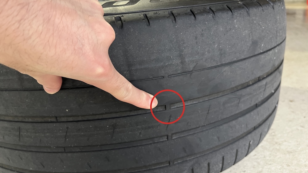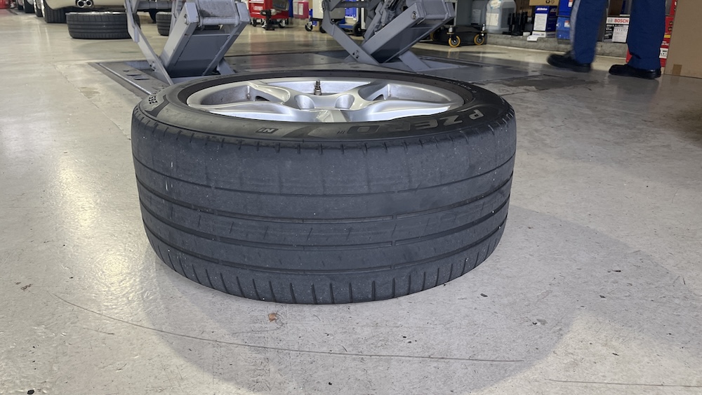 タイヤは摩耗が進み、スリップサインが出ている状態でしたが、車検基準の1.6mmはギリギリクリアといった状態でした。