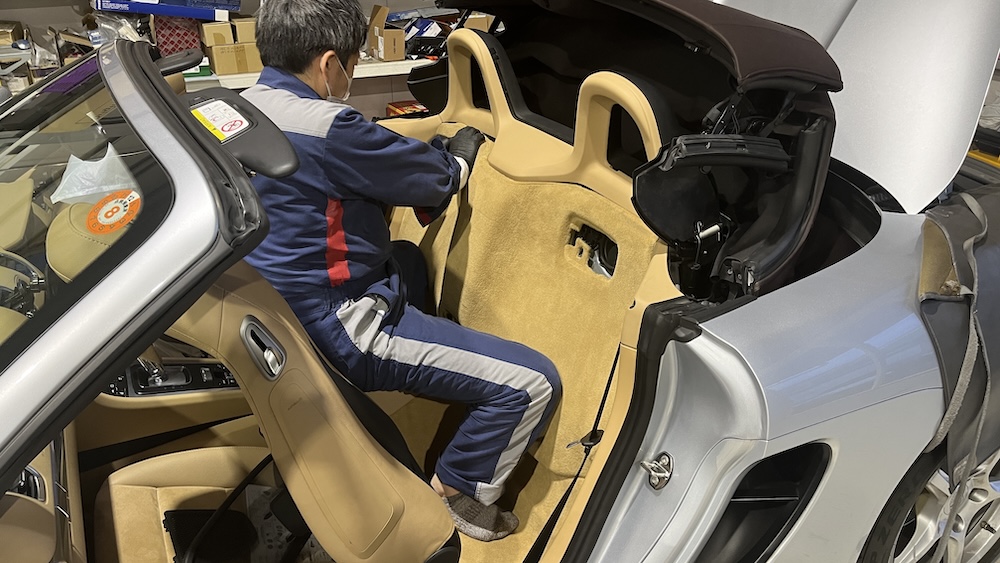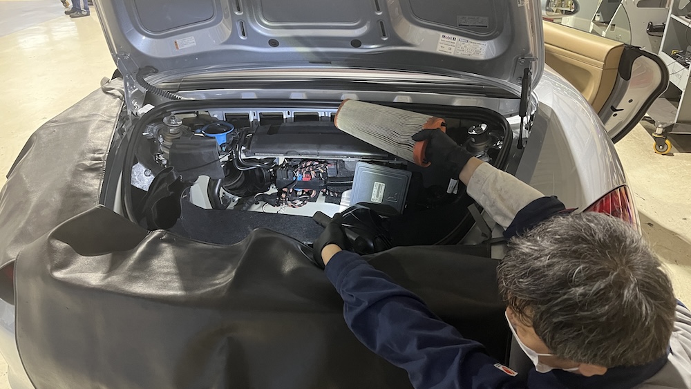ケイマンおよびボクスターは、車両構造上、エンジンルームへアクセスするためにエンジンカバーを外す工程があり、他の車種と比べて作業工程が多くなります。