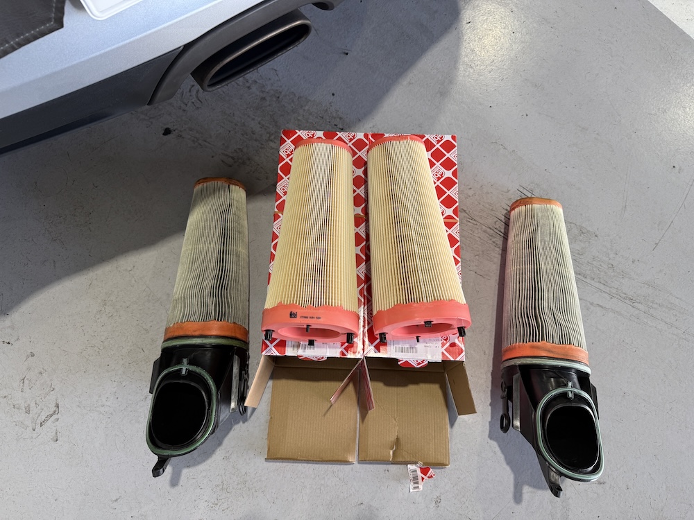↑ 左右が取り外したエアフィルター。中央2つが新品のエアフィルターです。