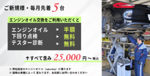 ご新規様・毎月先着5台|エンジンオイル交換キャンペーンご利用で、エンジンオイル代半額・下回り点検・テスター診断無料